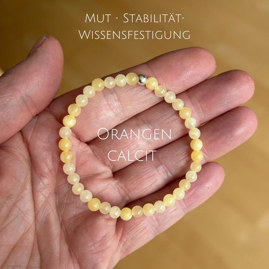 In diesem Armband findest du den Orangencalcit. Dieser stärkt den Mut neuen Dingen zu begegnen, fördert innere Stabilität (Calcium) und unterstützt die Festigung von aufgenommem Wissen.