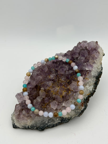Edelsteinarmband Rosenquarz mit Amazonit, Chalcedon und versteinertem Holz