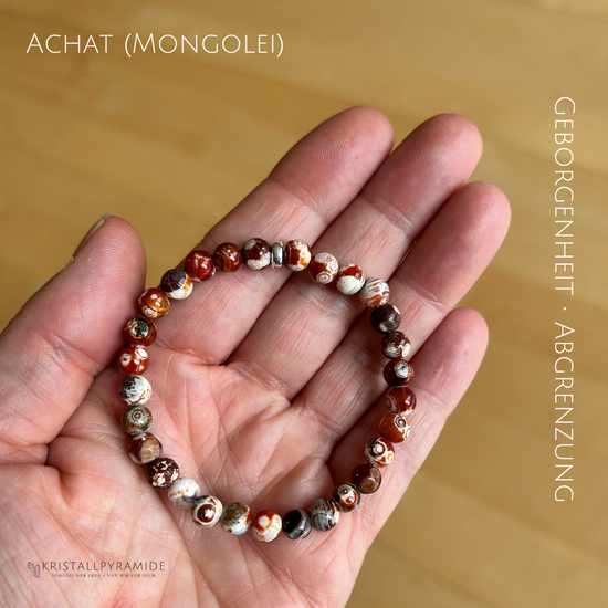 Diese wundervoll charakterstarke Achatvarietät stammt aus der Mongolei, und steht für Geborgenheit, Wärme, Umhüllt-Sein und Abgrenzung.