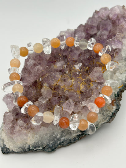 Der Mondstein steht für Intuition und Ausgleich. Zudem kann er sich positiv auf unseren Hormonhaushalt auswirken. Der Bergkristall kann in dieser Kombination zusätzliche Energie und Kraft schenken.