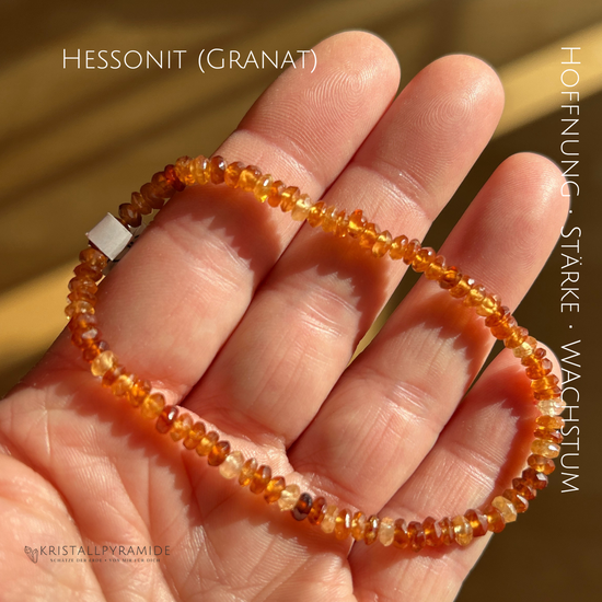 Der Hessonit ist eine Granatvariation und steht für Hoffnung und Stärke. Gerade in Zeiten in denen man viel Kraft und Durchhaltevermögen benötigt.