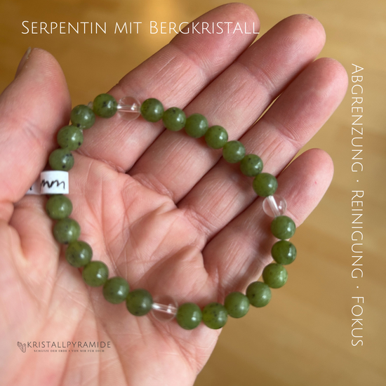 Serpentin verleiht in Kombination mit dem Bergkristall eine friedliche, fokussierte und ausgleichende innere Haltung. Ihm wir nachgesagt er hilft sich abzugrenzen, wenn im Außen Zuviel los ist.